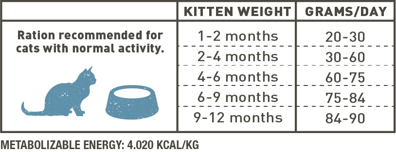 KITTEN SALMÓN ALIMENTO COMPLETO PARA GATOS Composición Salmón deshidratado, tapioca, grasa de ave (Fuente de ac. grasos -6), guisantes, proteína hidrolizada de salmón, proteína de patata, levadura y extracto de levadura-Saccharomyces cerevisiae (Fuente de mananooligosacáridos – MOS y -glucanos), boniato, aceite de salmón (Fuente de ac. grasos -3-EPA y DHA), vaina de algarroba, pulpa de remolacha, minerales, inulina (fibra soluble de achicoria, fuente fosfooligosacáridos – FOS), celulosa natural (Fuente de fibra insoluble), fibra dietética soluble extraída de Plantago ovata, aceites esenciales (orégano, canela, clavo, tomillo, romero, hierba buena, té verde), yucca, hidrolizado de crustáceos (Fuente de Glucosamina), hidrolizado de cartílago (Fuente de Condroitina), concentrado de zumo de melón liofilizado (Rico en superoxido dismutasa – SOD). Componentes analíticos Proteína bruta 38,00%, Grasa bruta 18,00%, Fibra bruta 1,90%, Ceniza bruta 7,80%, Calcio 1,30%, Fósforo 1,10%, Sodio 0,40%, Magnesio 0,09%, Humedad 8,00%, EPA+DHA 0,50%, Glucosamina clorhidrato 300mg/kg, Condroitín sulfato 220mg/kg. Aditivos Aditivos nutricionales: Vitamina A 28.000 U.I/kg.,Vitamina D-3 1.600 U.I/kg.,Vitamina E 600 mg/kg., Vitamina C 300 mg/kg., Biotina 2.600 mcg/kg., L-Carnitina 120 mg/kg, Cloruro de colina 3.220 mg/kg., Taurina 2.000 mg/Kg., Hierro (Sulfato ferroso monohidratado) 60 mg/kg., Hierro (Quelato ferroso de hidrato de glicina) 60 mg/kg, Cobre (Sulfato cúprico pentahidratado) 5 mg/kg., Cobre (Quelato de cobre del análogo hidroxilado de la metionina) 8 mg/kg., Manganeso (Sulfato manganoso monohidratado) 12 mg/kg., Manganeso (Quelato de manganeso del análogo hidroxilado de la metionina) 18 mg/kg., Zinc (Sulfato de zinc monohidratado) 50 mg/kg., Zinc (Quelato de zinc del análogo hidroxilado de la metionina) 70 mg/kg., Iodo (Yoduro de potasio) 3,8 mg/kg., Selenio (Selenito de sodio) 0,05 mg/kg., Selenio (Análogo hidroxilado de la selenometionina) 0,20 mg/kg. Aditivos tecnológicos: Antioxidantes naturales (Aceites vegetales ricos en tocoferoles).