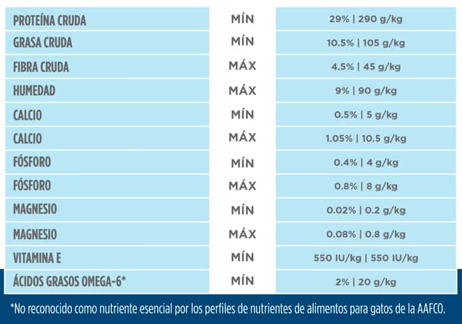 Arroz de cervecería, hígado de pollo hidrolizado, concentrado de proteína de arroz, celulosa en polvo, aceite de soya, aceite de coco, saborizante de hígado de pollo, carbonato de calcio, ácido láctico, cloruro de potasio, sulfato de calcio, monoestearato de glicerilo, fosfato dicálcico, L-treonina, DL-metionina, L-lisina, cloruro de colina, vitaminas (complemento de vitamina E, L-ascorbil- 2-polifosfato (fuente de vitamina C), complemento de niacina, mononitrato de tiamina, pantotenato de calcio, complemento de vitamina A, clorhidrato de piridoxina, biotina, complemento de riboflavina, complemento de vitamina B12, ácido fólico, complemento de vitamina D3), taurina, sal yodada, citrato de potasio, L-triptofano, minerales (sulfato ferroso, óxido de zinc, sulfato de cobre, óxido manganoso, yodato de calcio, selenito de sodio), tocoferoles mixtos para la frescura, sabores naturales, beta caroteno.