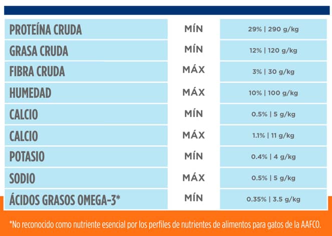 Pollo, maíz entero, harina de gluten de maíz, trigo entero, arroz de cervecería, grasa de pollo, harina de pollo, producto de huevo, saborizante de cerdo, aceite de soya, aceite de pescado, L-lisina, ácido láctico, sulfato de calcio, cloruro de potasio, cloruro de colina, citrato de potasio, vitaminas (complemento de vitamina E, complemento de niacina, mononitrato de tiamina, pantotenato de calcio, clorhidrato de piridoxina, complemento de vitamina A, complemento de riboflavina, biotina, complemento de vitamina B12, ácido fólico, complemento de vitamina D3), taurina, DL-metionina, sal yodada, minerales (sulfato ferroso, óxido de zinc, sulfato de cobre, óxido manganoso, yodato de calcio, selenito de sodio), L-triptófano, tocoferoles mixtos para la frescura, sabores naturales, beta caroteno.