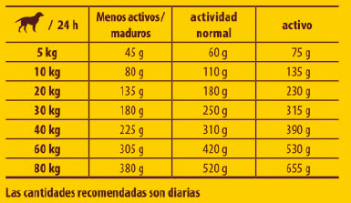 * Las cantidades recomendadas se basan en el peso que alcanzará un perro adulto. Durante el desarrollo, es idóneo un índice de crecimiento moderado basado en el uso adecuado de energía. Es recomendable reducir el consumo de alimentos si su perro es demasiado grande y fuerte. Con dosis más pequeñas, también se garantiza el suministro adecuado de nutrientes.
